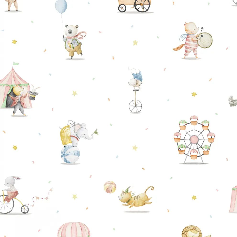 Cirkuszi motívumokkal díszített kisállatos tapéta-kollekció, háromféle színben. Pasztell színei finoman díszitik a gyerekszobát.