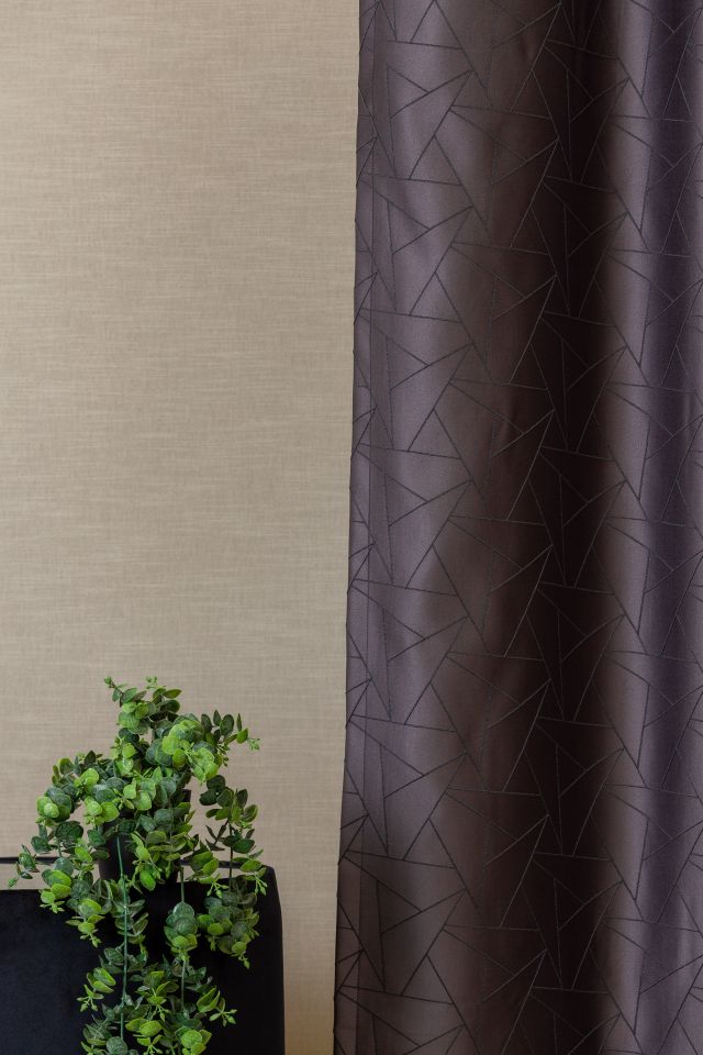 Anyagában szövött geometriai mintával díszített dekorfüggöny, kétféle trendi színváltozatban. Súlya : 227,6 g/m2