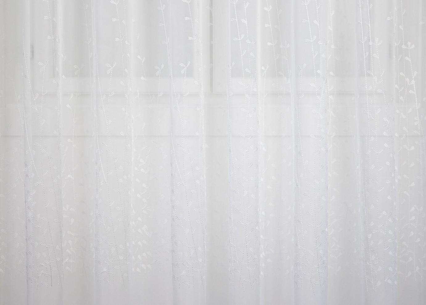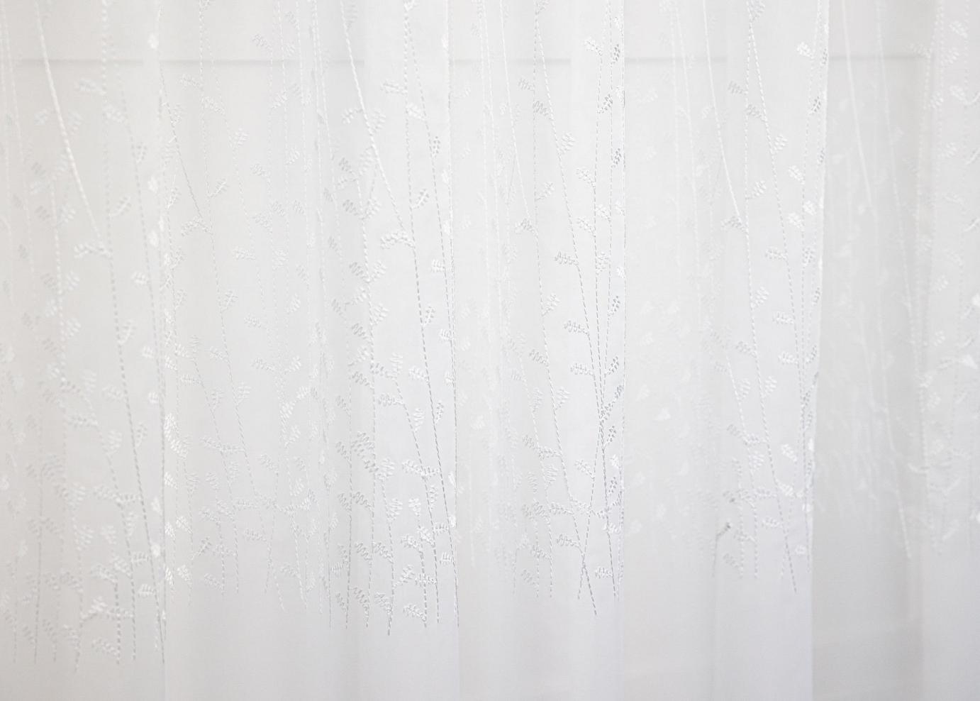 Fehér alapba hímzett apró levélminták díszítik ezt a fényáteresztő függönyt, amely két színben elérhető. Kb.1 méterig hímzett.