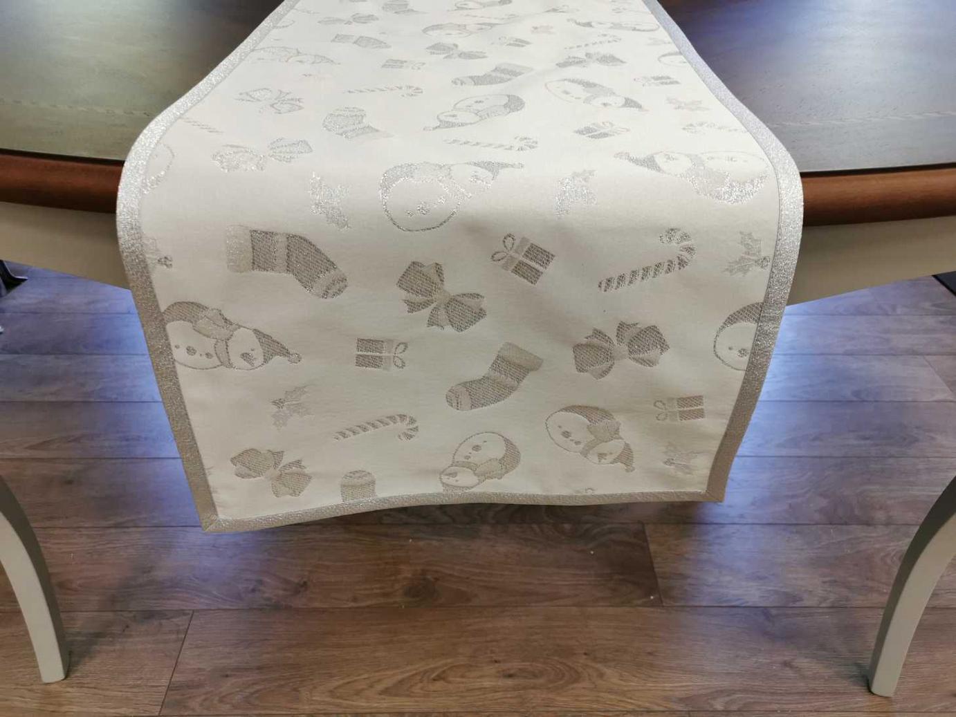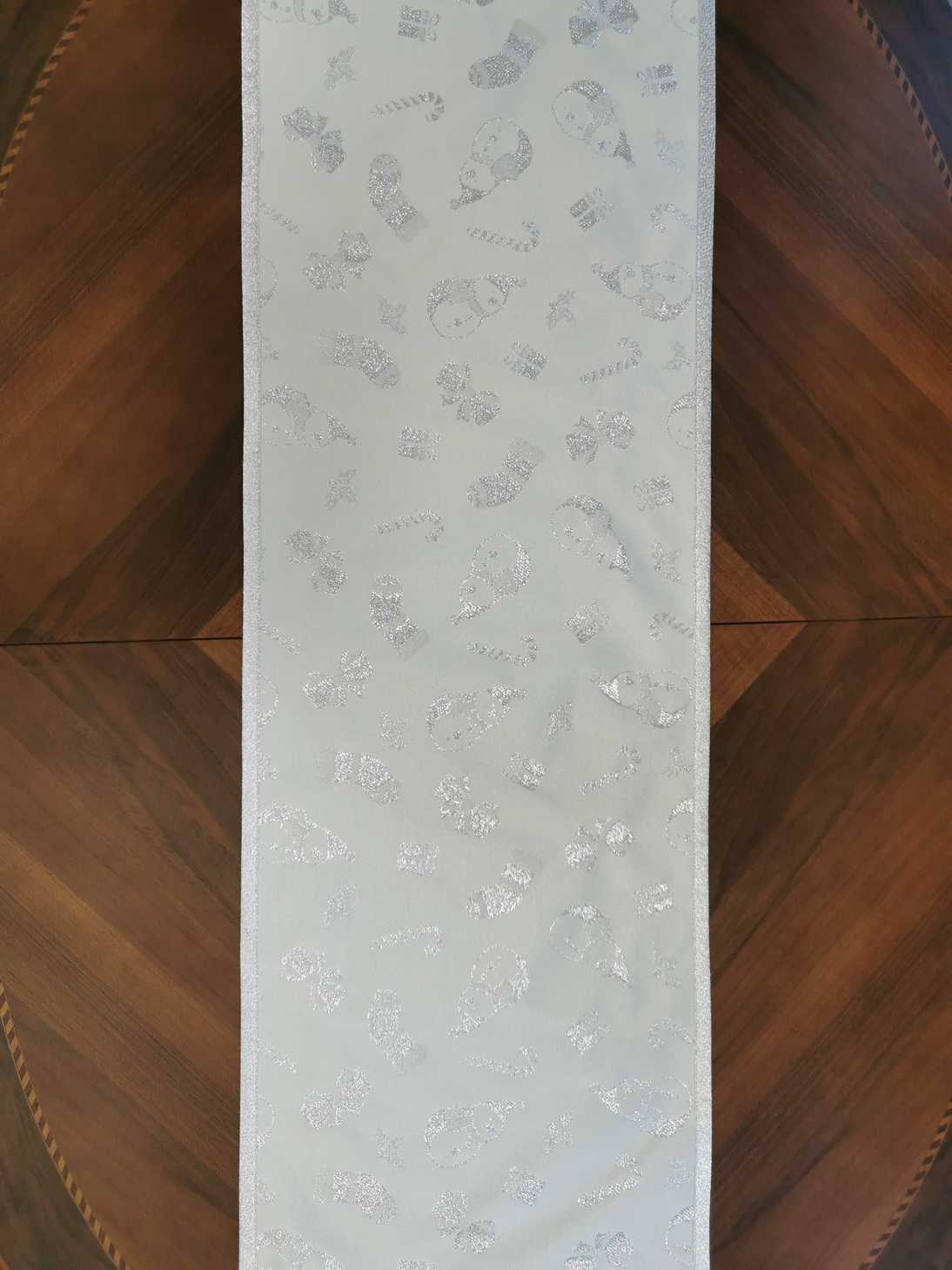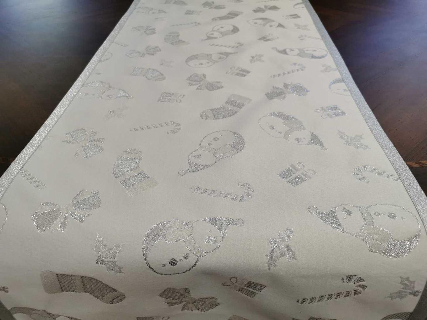 Különleges karácsonyi futó. Egyedi ezüst hóemberekkel díszített, hozzáillő ezüst ferdepánttal körbeszegve. Bármilyen méretben rendelhető, hívjon bátran!