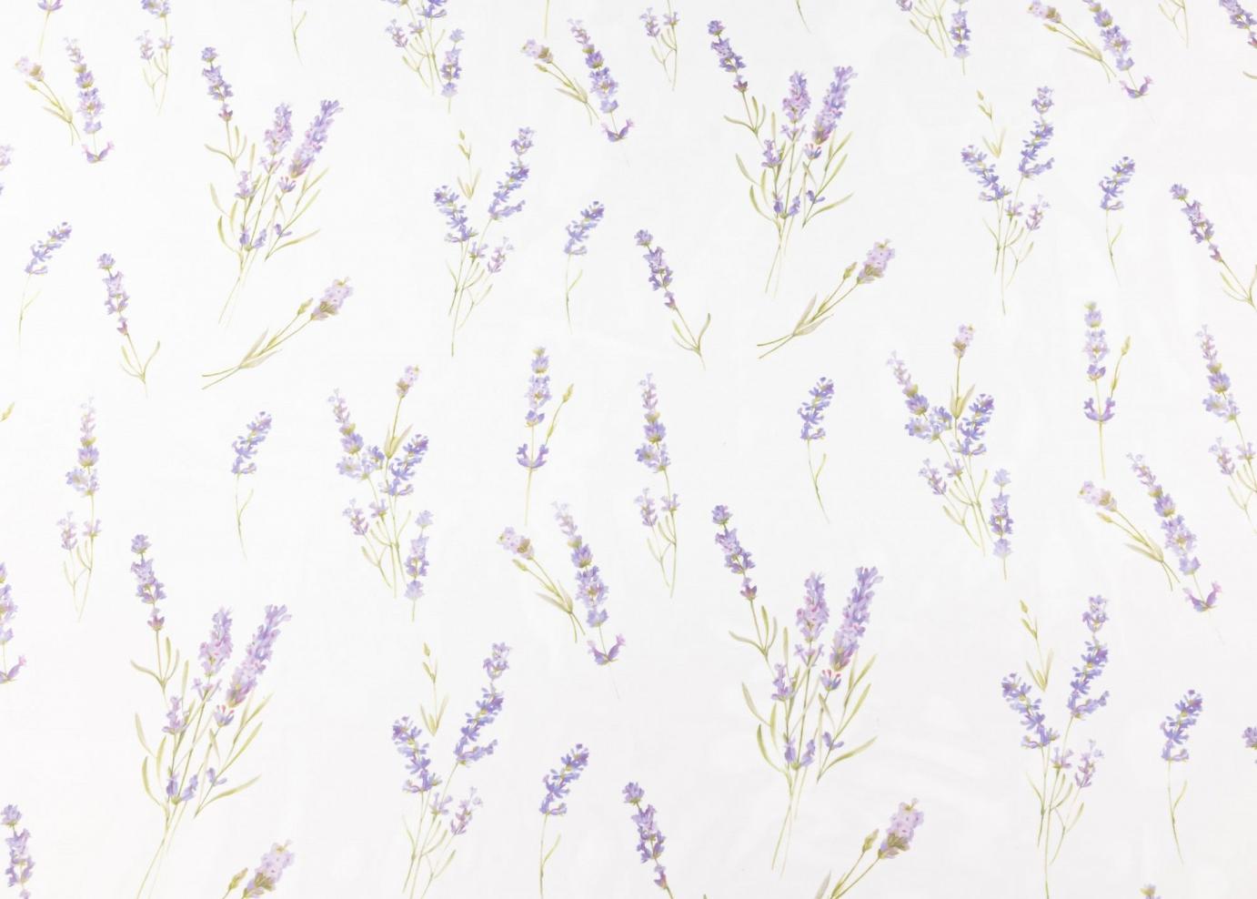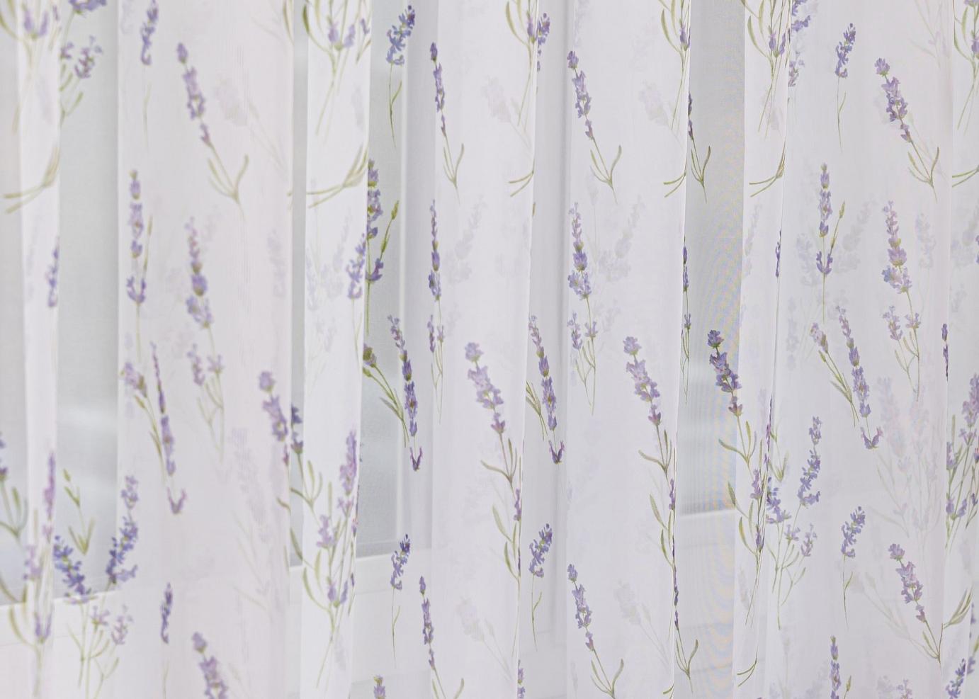 Finom pasztell színű levendulákkal díszített voál függöny különlegesség. Mezei virágos párja is megtalálható webáruházunkba.