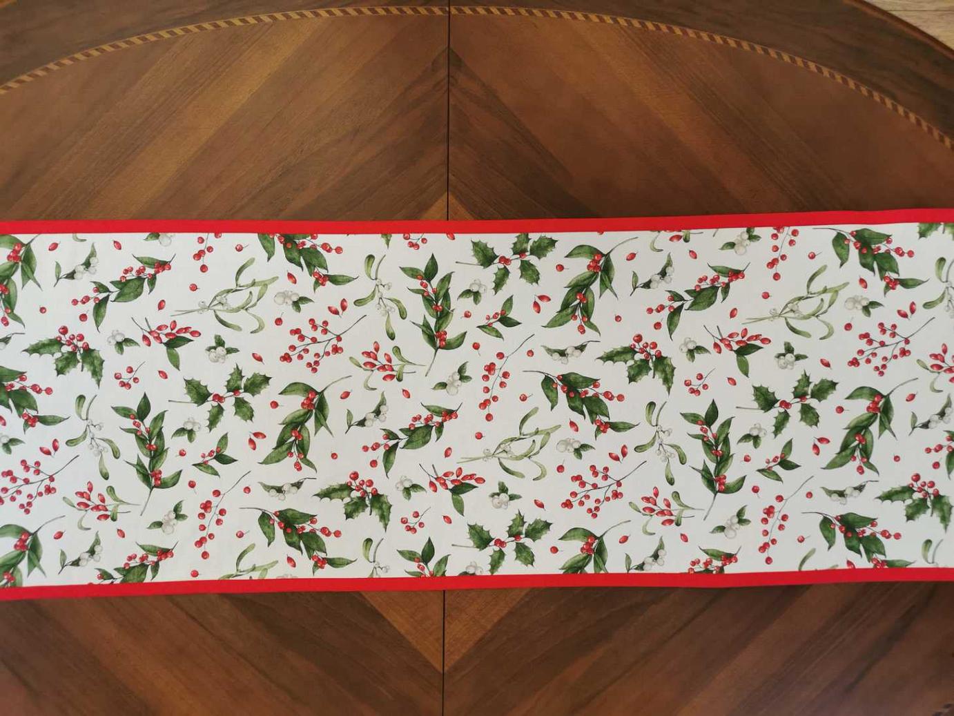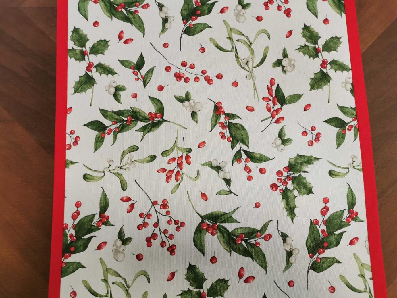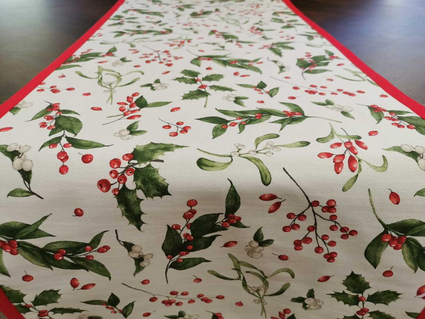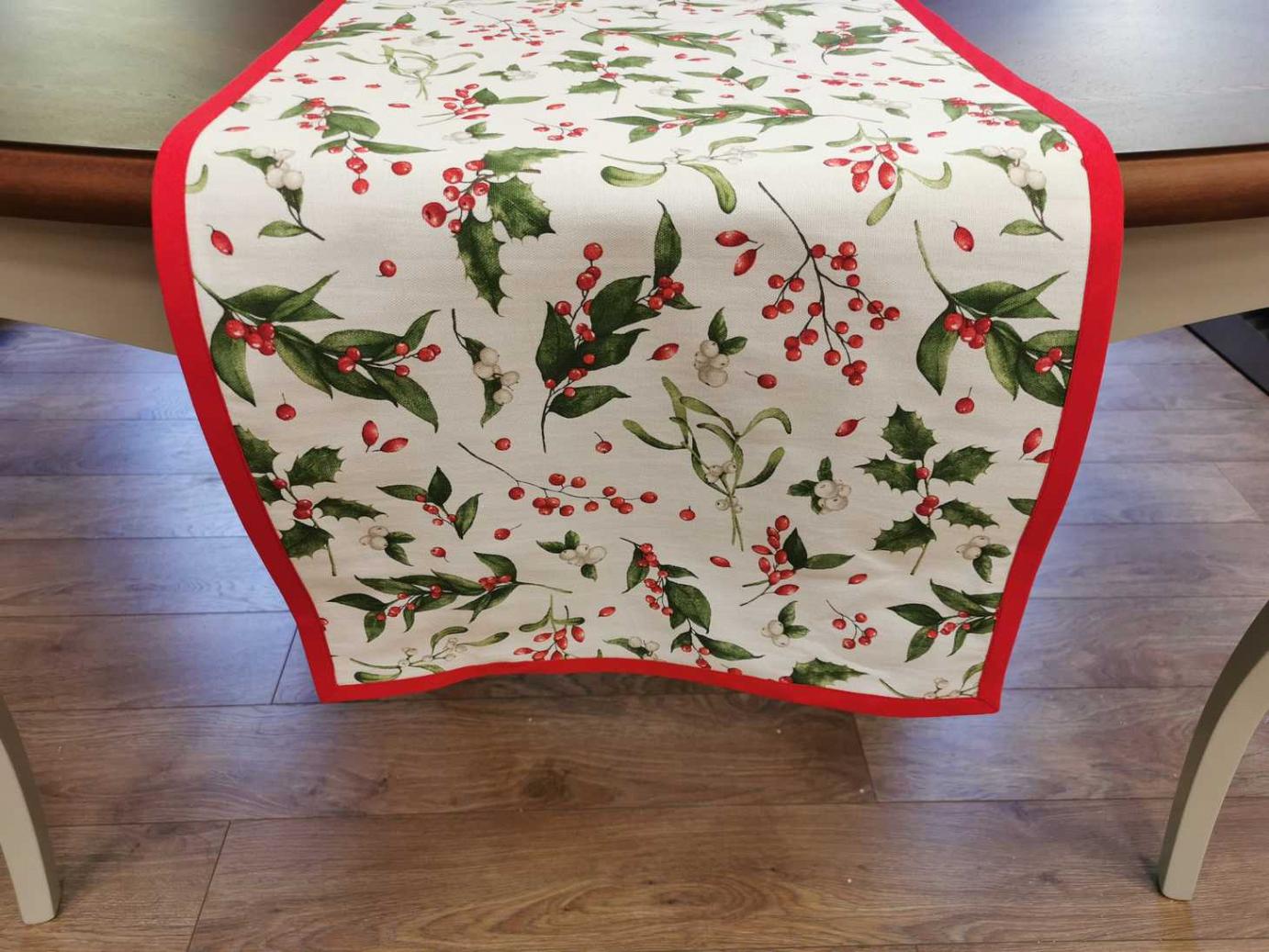Különleges karácsonyi futó. Magyal ággal és csipkebogyókkal díszített futó, hozzáillő piros ferdepánttal körbeszegve. Bármilyen méretben rendelhető, hívjon bátran!