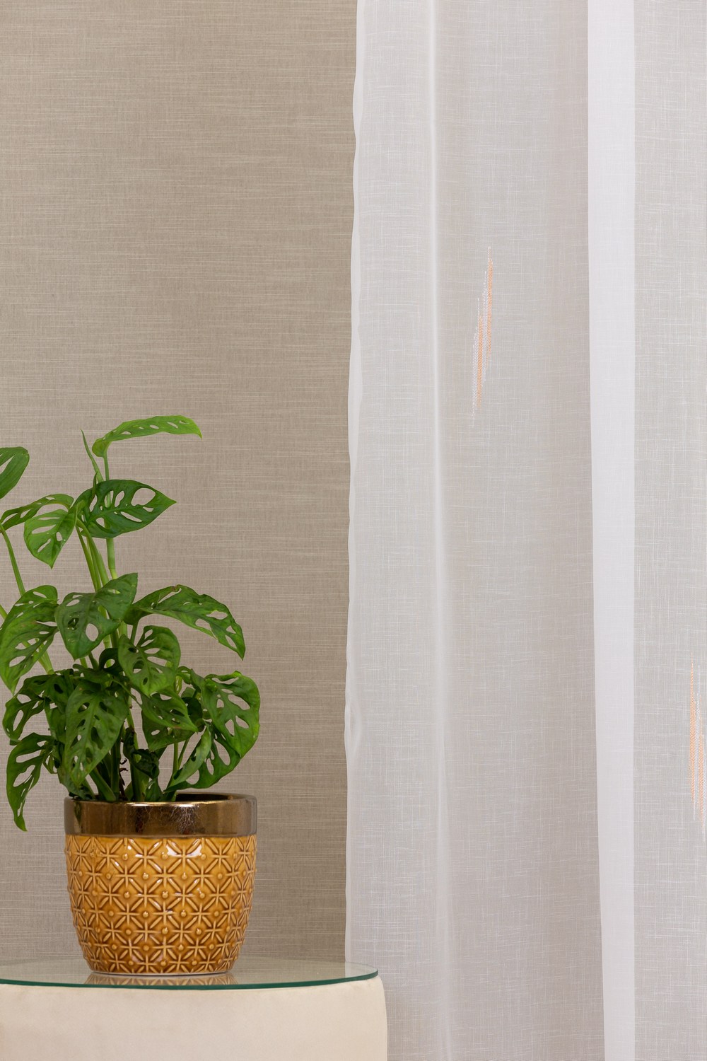 Ezüst vagy narancs színű apró mintákkal beszőtt sablé fényáteresztő függöny.
