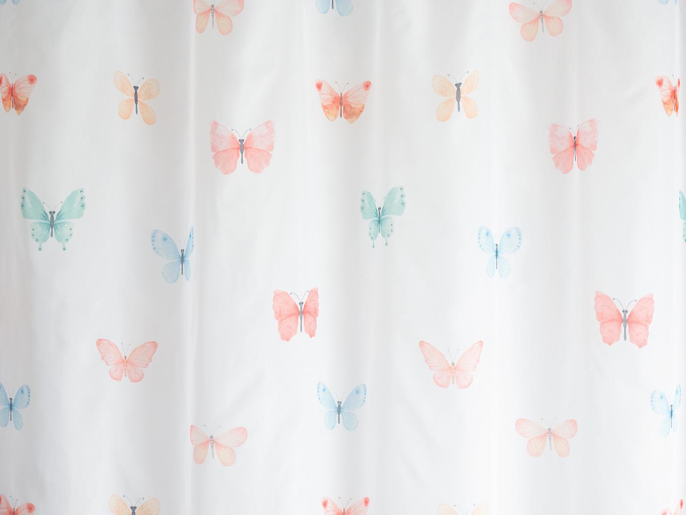 Színes pillangókkal díszített fényáteresztő függöny.